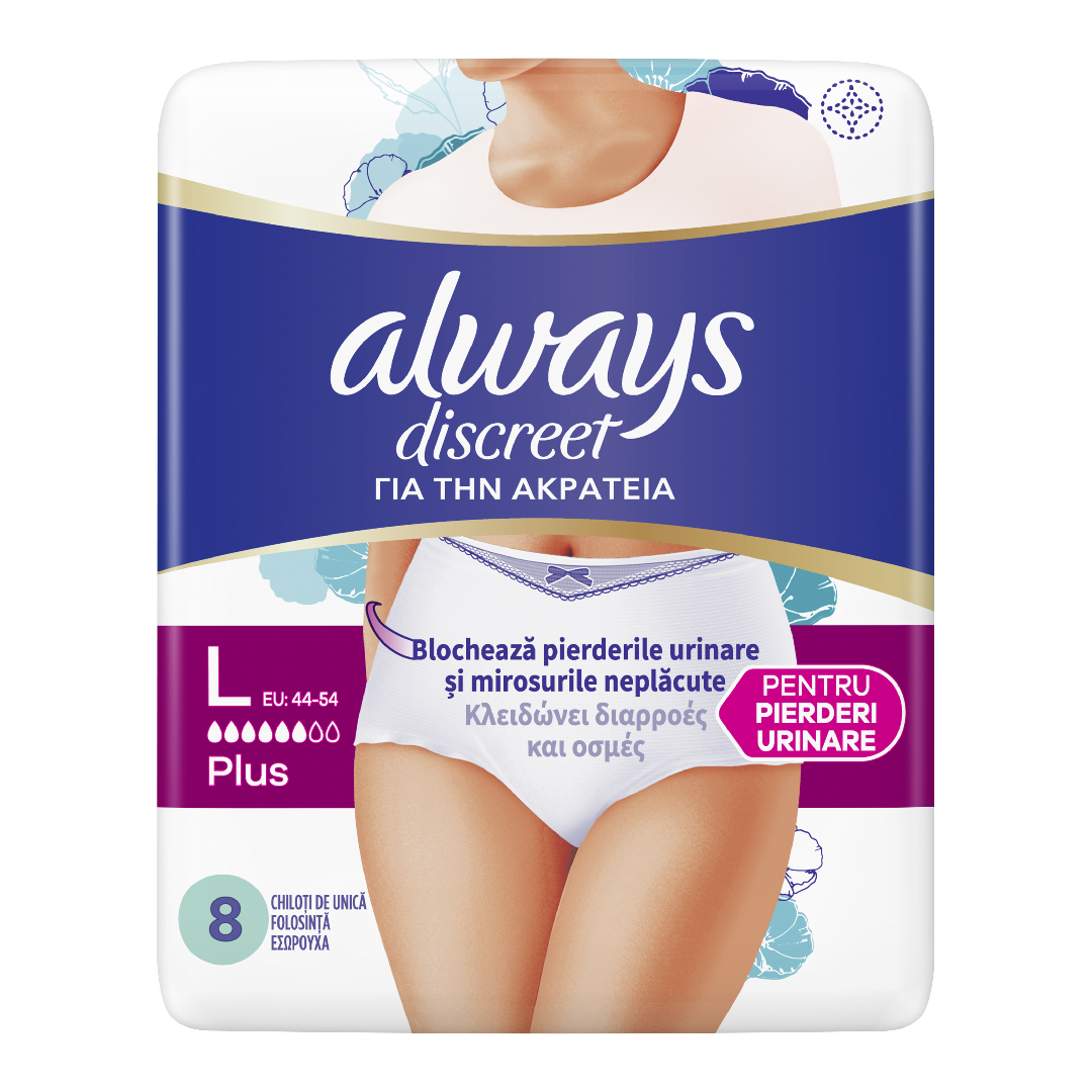 Always Discreet Pants Chiloti pentru incontinenta urinara Large, 8 bucati, Frumusete si ingrijire > Frumusete si ingrijire > Ingrijire corp > Frumusete si ingrijire > Ingrijire corp > Tampoane si Absorbante > Frumusete si ingrijire > Ingrijire corp > Incontinenta urinara > Produse Incontinenta Urinara > Produse Incontinenta Uri