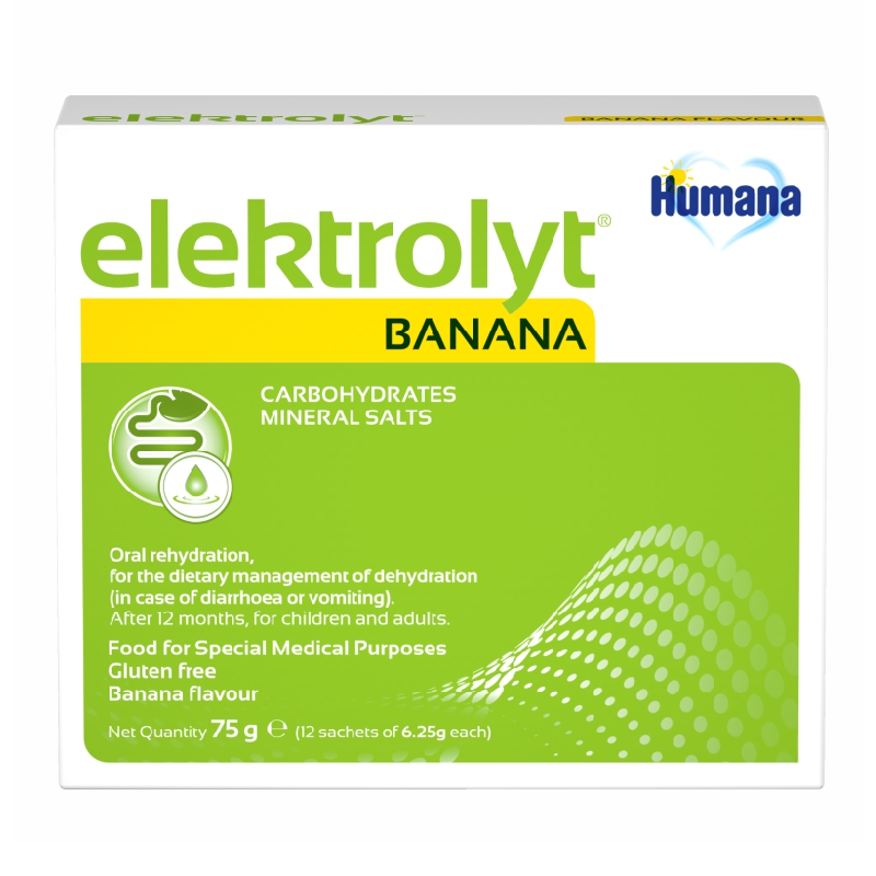 Supliment alimentar pentru rehidratare orala cu carbohidrati si saruri minerale util pentru furnizarea suplimentara a acestor nutrienti in dieta zilnica, in scopul limitarii deshidratarii. Produsul Humana Elektrolyt Banana prin compozitia sa compenseaza pierderea de saruri minerale si lichide ajutand la atenuarea starii de deshidratare si la echilibrarea hidroelectrolitica.