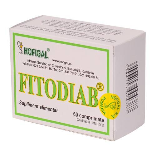Fitodiab de la Hofigal este un supliment alimentar utilizat in ameliorarea diabetului de tip II (noninsulino-dependent), cu sau fara exces ponderal. Hofigal Fitodiab poate fi asociat insulinoterapiei, ca adjuvant in diabetul zaharat de tip I (insulino-dependent).Indicatii Fitodiab de la Hofigal:• actiune hipoglicemianta, hipolipemianta, antioxidanta;• normalizeaza nivelul colesterolului si al trigliceridelor din sange;• combate nivelul crescut al zaharului din sange.Ingrediente: • Pulbere din fructe de afin ( Myrtilli fructus), pulbere din frunze de dud alb ( Mori alba folium), pulbere din teci de fasole fara seminte ( Phaseoli fructus sine seminibus), pulbere din frunze de mesteacan ( Betulae folium) si excipienti.Mod de administrare: Doza utilizata variaza intre 2 si 6 comprimate pe zi in functie de tipul bolii si de nivelul glicemiei:• bolnavii cu diabet zaharat de tip II, cu nivelul glicemiei cuprins intre 120-150 mg/dl, 2 comprimate/zi la fiecare masa principala;• bolnavii cu diabet zaharat de tip II, cu nivelul glicemiei cuprins intre 150-200 mg/dl, 4 comprimate/zi, cate una la fiecare din cele trei mese principale si una la gustarea de la ora 11;• bolnavii cu diabet zaharat de tip II, cu nivelul glicemiei mai mare de 200 mg/dl, 6 comprimate/zi, cate una la cele trei mese principale si la cele trei gustari.