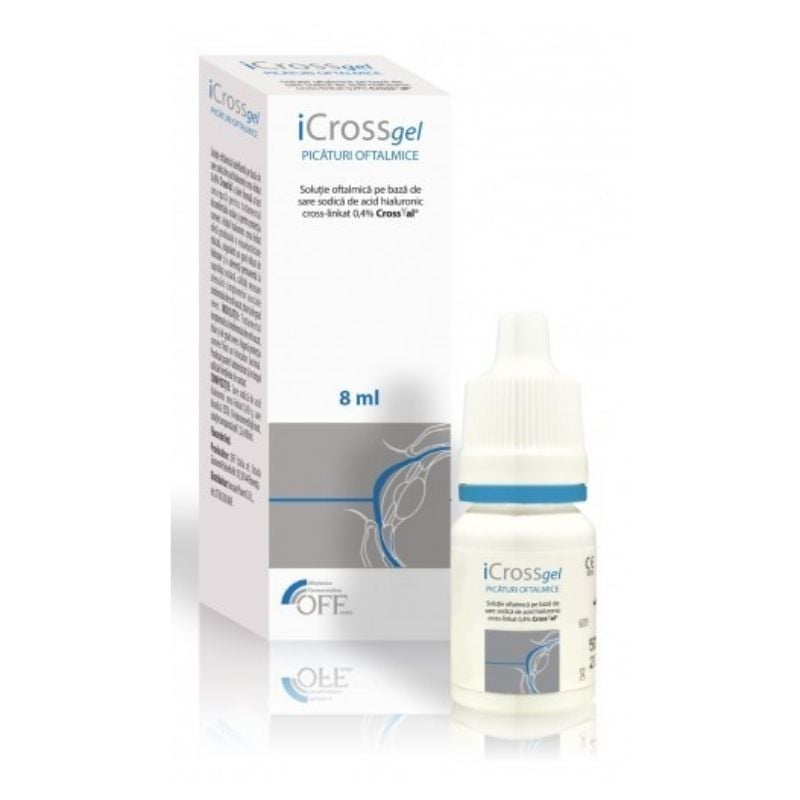Beneficii Icross gel picaturi oftalmice:iCrossgel este o solutie oftalmica lubrifianta pe baza de sare sodica de acid hialuronic cross-linkat, a carei formula a fost conceputa pentru tratamentul disconfortului ocular si pentru protectia corneei.Acidul hialuronic cross-linkat ofera produsului o viscoelasticitate ridicata, asigurand un grad ridicat de hidratare si o aderenta permanenta la suprafata oculara, calitati necesare atenuarii simptomelor asociate sindromului de ochi uscat.Solutie oftalmica lubrifianta recomandata in tratamentul simptomatic al sindromului de ochi uscat, chiar si de grad sever. Asigura protectia corneei fiind un inlocuitor lacrimal.Produsul poate fi administrat pentru a imbunatati gradul de lubrifiere a ochilor si in timpul utilizarii lentilelor de contact.Util dupa:Expunerea prelungita la lumina soarelui;Stationarea in spatii cu aer conditionat;Utilizarea prelungita a terminalelor video;Contactul cu diferite substante cu rol de curatare;Utilizarea lentilelor de contact.Mod de utilizare Icross gel picaturi oftalmice:Picurati una sau doua picaturi in fiecare ochi de una sau mai multe ori pe zi sau conform sfatului medicului.Ingrediente Icross gel picaturi oftalmice:Sare sodica de acid hialuronic cross-linkat 0,40 g, sare disodica EDTA, N-hidroximetilglicinat, solutie tamponata pH 7,2 la 100 ml.