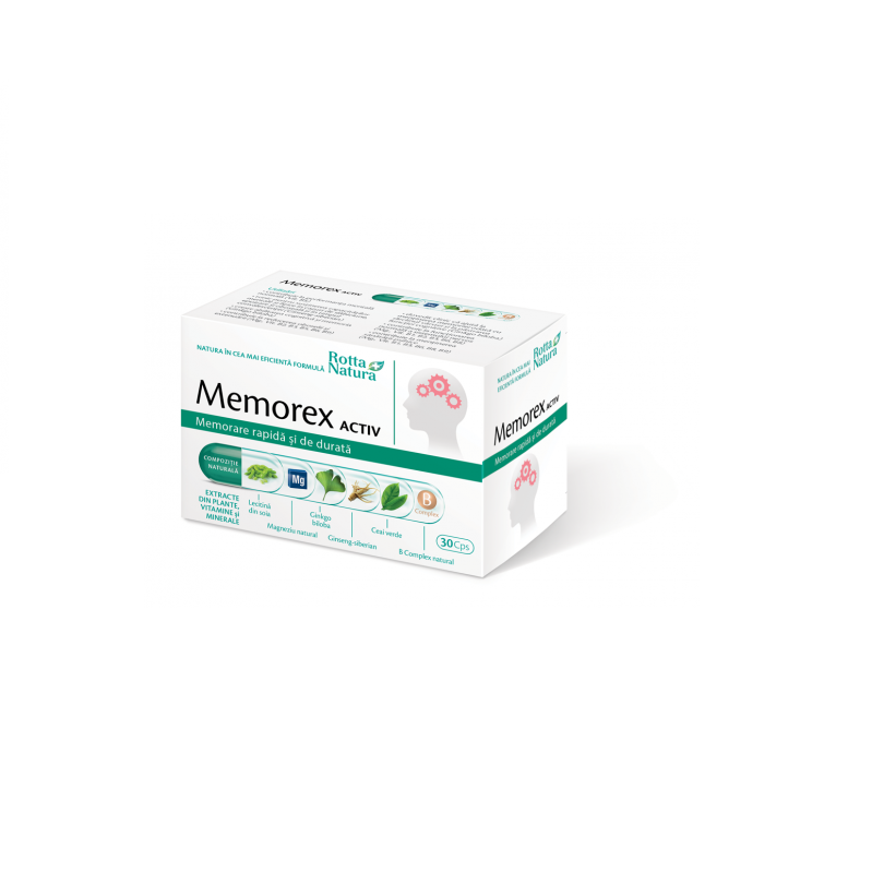 Formula avansata pentru memorie contine 6 ingrediente care actioneaza in mai multe directii pentru a asigura o concentrare puternica, o memorare mai buna si un nivel energetic ridicat. Memorex Activ inglobeaza cele mai importante ingrediente pentru ca tu sa obtii cele mai bune rezultate in conditii de solicitare intelectuala si fizica intensa.Extractul de Ginkgo biloba, prezent intr-o cantitate eficienta (80mg.) sprijina circulatia sangvina la nivelul creierului, asigurand astfel o oxigenare optima, si, implicit, o mai buna capacitate de concentrare.Extractul de Ceai-verde are rol de tonic general, actionand pozitiv in stari de oboseală cronica, iar cafeina mentine mintea agera si organismul energizat. Pentru ca efectul Memorex Activ sa fie complet, Lecitina din compozitie asigura nutritia celulei nervoase si sustine refacerea membranei neuronale, ajutand astfel la fixarea informatiilor pentru o perioada indelungata de timp.Combinatia binecunoscuta de Magneziu+ Vit. B6 este prezenta pentru a acorda un suport suplimentarin functionarea normala a sistemului nervos, in reducerea oboselii si a extenuarii.sustine capacitatea de memorare, concentrare si efortul intelectualenergizeaza corpul si minteacontribuie la reducerea oboselii si extenuariicontribuie la functionarea normala a sistemului nervoscontribuie la mentinerea sanatatii psihicecontribuie la un metabolism energetic normalcontribuie la functionarea normala a sistemului muscularasigura nutritia celulei nervoase si intervine in transmiterea optima a impulsului nervosRecomandat:in perioadele de efort intelectual intens cum ar fi cele de pregatire a examenelorpentru cresterea capacitatii de concentrare si de imbunatatire a memorieiin cazuri de epuizare si surmenaj psihicutil persoanelor cu scaderi de capacitate intelectuala, pierderi de memoriePoate interactiona cu produse anticonvulsivante, antiaritmice, antiagregant-plachetare, anticoagulante, heparine cu densitate redusa, agenti trombolitici, insulina, diuretice tiazinice, inhibitori ai monoaminoxidazei (MAOI) si antiinflamatoare nesteroidice (NSAID) la administrare concomitenta. A nu se administra copiilor sub 16 ani, femeilor gravide, celor care alapteaza, persoanelor cu hipertensiune arteriala, sau persoanelor cu sensibilitate crescuta la oricare dintre ingredientele produsului.Ingrediente pentru doza zilnica de doua capsule:Lecitina 500 mg.Magneziu 100 mg. (26% din DZR)Extract din frunze de Ginkgo biloba cu 24% ginkgoflavone si 6% terpene lactonice - 160 mg.Cafeina anhidra 160 mg.Extract apos 5-7:1 din frunze de Ceai verde 32 mg.Vit. B6- 2,4 mg. (172% din DZR)