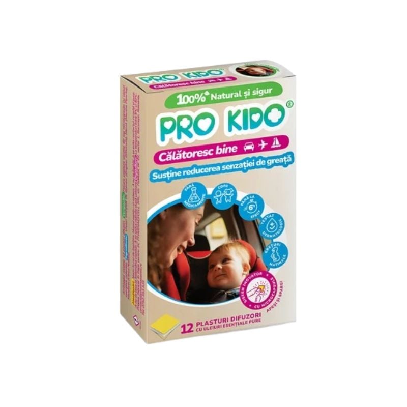 Plasturi naturali pentru rau de miscare pentru copii - Pro Kido Calatoresc bine ! Pro Kido Calatoresc bine ! este un plasture difuzor, inovator, cu microcapsule cu uleiuri esentiale naturale ce sustine reducerea senzatiei de greata ce apare in timpul calatoriilor ( cu masina , avionul, barca ), in cazul greturilor matinale din sarcina sau in cazul anxietatii sau a problemelor digestive.