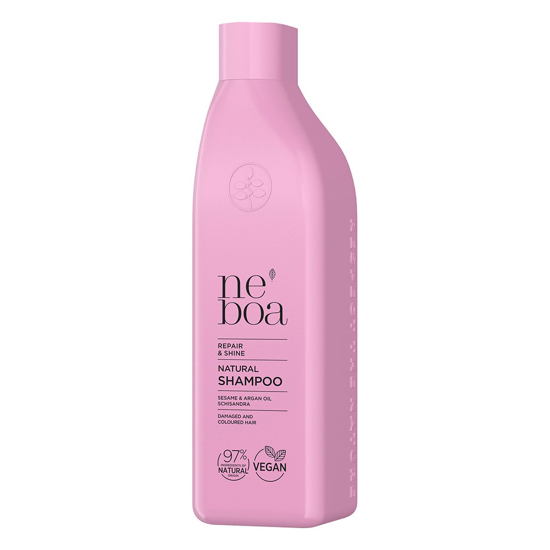 Sampon Natural Reparator pentru Stralucire, Repair & Shine, Neboa este potrivit pentru parul deteriorat sau vopsit. Contine extract de susan, ulei de argan si extract de Schisandra chinensis.