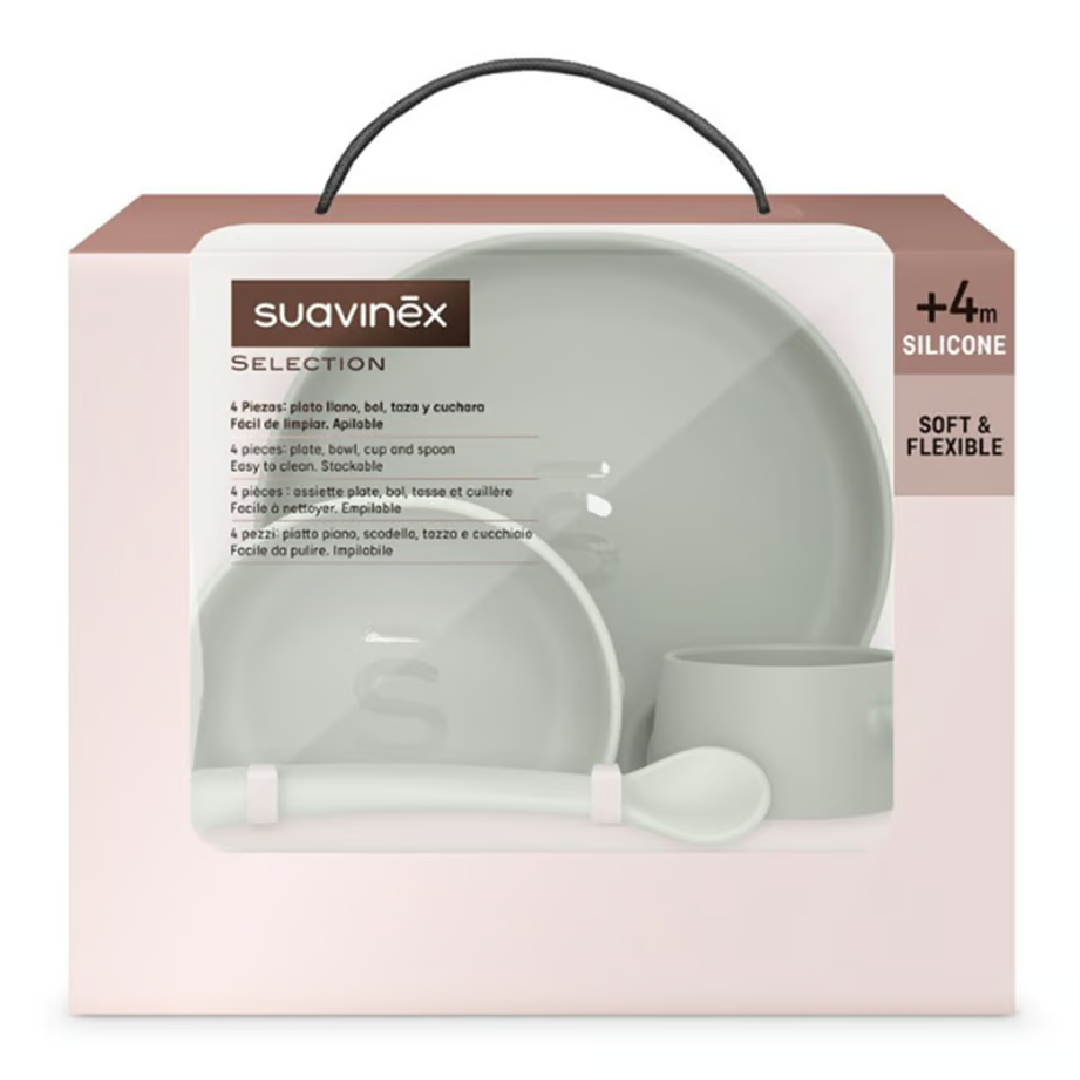 Set diversificare din silicon Colour Essence Suavinex este concepută pentru a răspunde tuturor nevoilor din perioada diversificării, include o ceașcă și tacâmuri cu mânere potrivite pentru mânuțele mici ale bebelușilor.Set diversificare flexibil din silicon Colour Essence este format din 4 piese:Farfurie platăBolCeșcuțăLingură