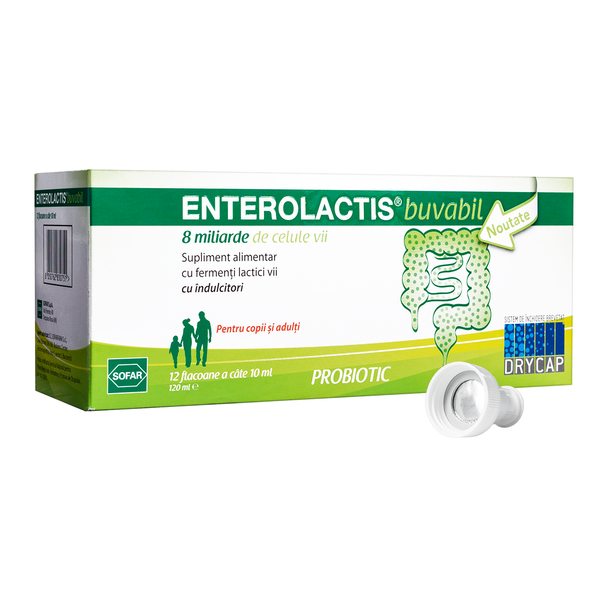 Enterolactis buvabil, 12 flacoane, Sofar - pentru o stare generala bunaTubul digestiv este populat de numeroase microorganisme care controleaza procesul digestiv si contribuie la sustinerea sistemului imunitar. Insa, cand apar factori care perturba flora intestinala, precum antibioticele, dezechilibrul imunitar, sedentarismul sau stresul, te poti confrunta cu diverse probleme. Printre acestea se numara halitoza, constipatia, stomac deranjat, balonare sau oboseala. Prin administrarea de Enterolactis buvabil, 12 flacoane, Sofar, echilibrul bacterian se restabileste. Enterolactis flacoane este un probiotic ce contine opt miliarde de celule vii care compun in mod normal flora intestinala.Enterolactis buvabil - un supliment sigurInainte de prima administrare, este important sa consulti Enterolactis prospect. Din continutul acestuia vei afla ca in formula se regaseste tulpina Lactobacillus si este indicat sa eviti administrarea concomitenta a unui alt produs cu acceasi tulpina. In plus, pentru ca produsul farmaceutic este lipsit de gluten si lactoza, este ideal pentru persoanele care au intolerante. De asemenea, se poate administra in siguranta in timpul sarcinii sau alaptarii. Comanda online Enterolactis buvabil, 12 flacoane, Sofar si imbunatateste-ti sanatatea intregului organism.