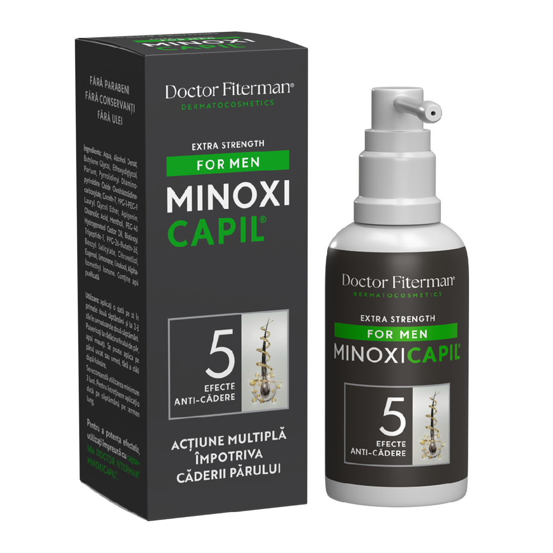 Spray-ul Minoxicapil Men de la Doctor Fiterman este un produs inovator destinat bărbaților care se confruntă cu probleme de cădere a părului. Acesta se remarcă prin formula sa eficientă, care acționează direct asupra scalpului, stimulând creșterea părului și îmbunătățind sănătatea acestuia. Fără parabeni și conservanți, acest spray este o alegere excelentă pentru cei care caută soluții naturale și eficiente.